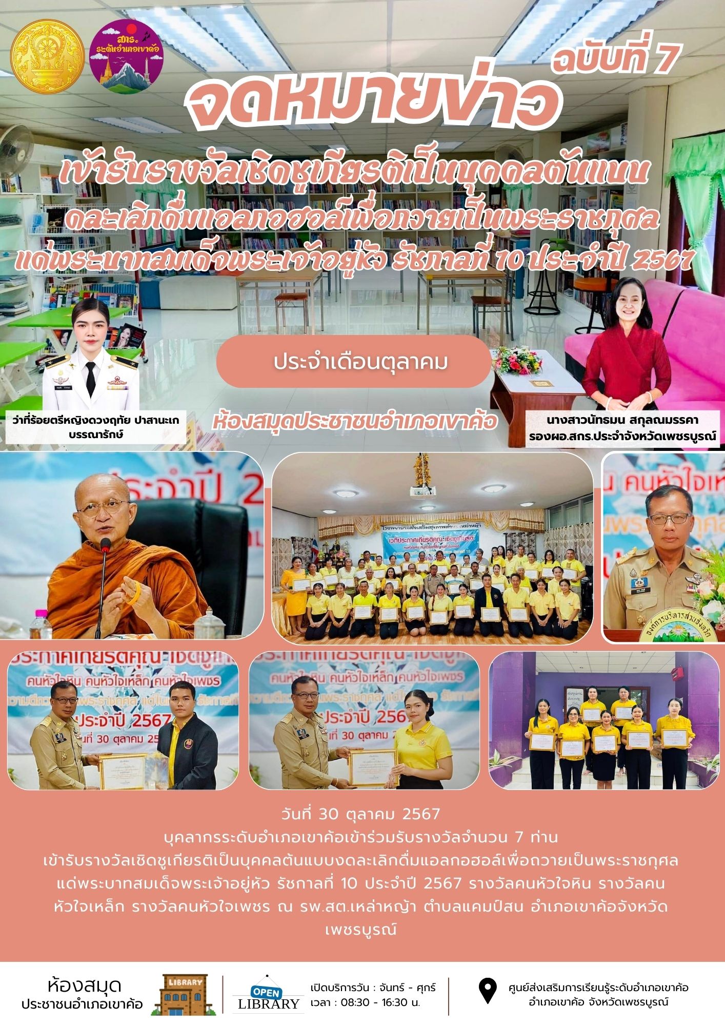 วันที่ 30 ตุลาคม 2567บุคลากรระดับอำเภอเขาค้อเข้าร่วมรับรางวัลจำนวน 7 ท่าน เข้ารับรางวัลเชิดชูเกียรติเป็นบุคคลต้นแบบงดละเลิกดื่มแอลกอฮอล์เพื่อถวายเป็นพระราชกุศลแด่พระบาทสมเด็จพระเจ้าอยู่หัว รัชกาลที่ 10 ประจำปี 2567 รางวัลคนหัวใจหิน รางวัลคนหัวใจเหล็ก รางวัลคนหัวใจเพชร ณ รพ.สต.เหล่าหญ้า ตำบลแคมป์สน อำเภอเขาค้อจังหวัดเพชรบูรณ์